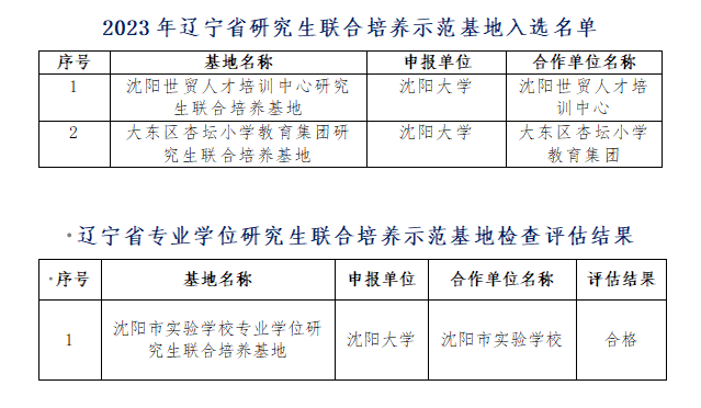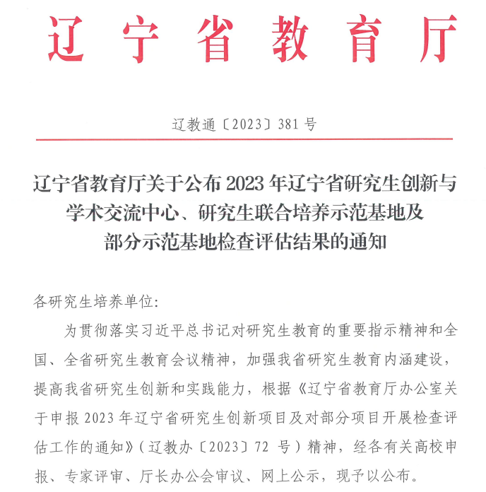 近日,辽宁省教育厅发布了《辽宁省教育厅关于公布2023年辽宁省研究生创新与学术交流中心、研究生联合培养示范基地及部分示范基地检查评估结果的通知》(辽教通〔2023〕381号),我校有2个实践基地成功入选,截至目前我校已有8个省级研究生联合培养示范基地;1个示范基地通过检查评估。
