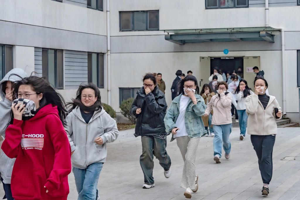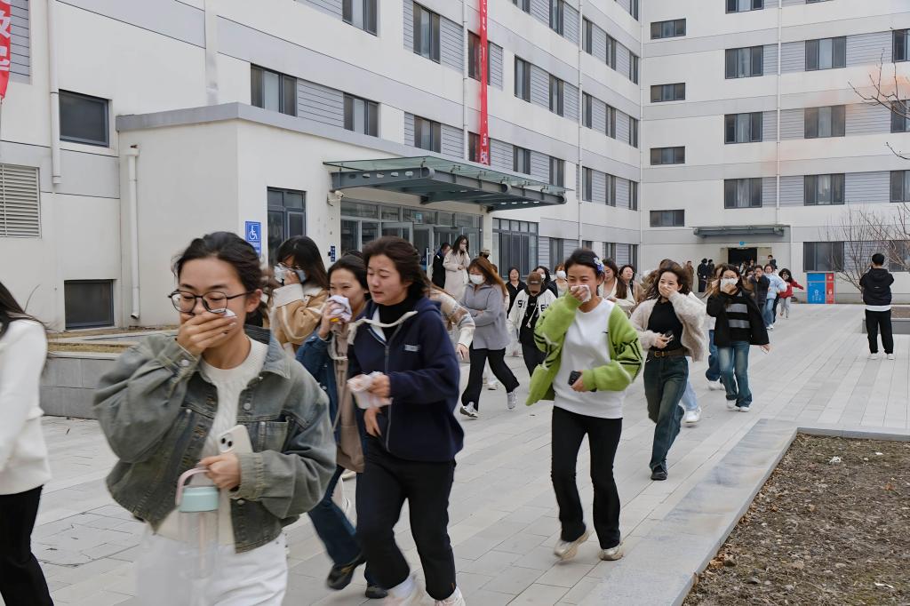 参加演练学生通过楼内疏散通道全部有序撤离宿舍楼