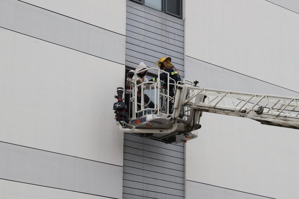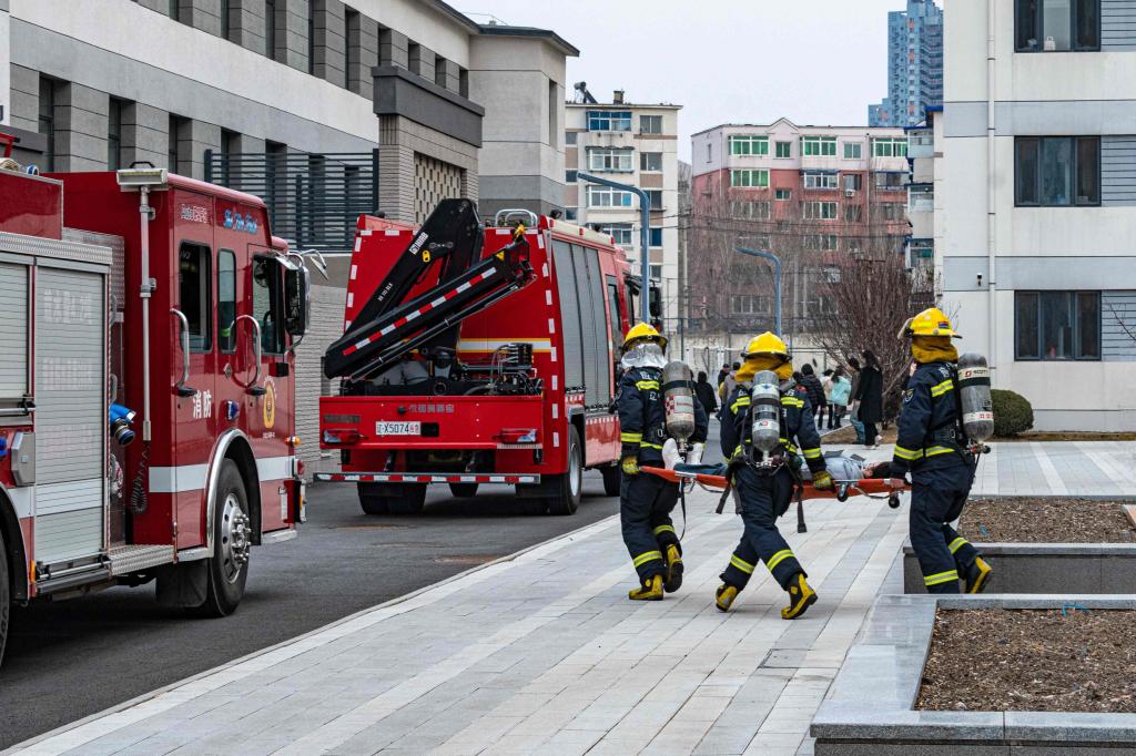 接到疏散指令后,各寝室学生在寝室长、楼层长、楼长、辅导员的组织引导下用湿毛巾蒙住口鼻、降低重心、俯身向下,仅用2分58秒,860名学生按照就近的楼内疏散通道全部有序撤离宿舍楼,并按照规定的校园疏散路线,迅速在北院操场指定位置列队集合。楼长清点完人数后,演练于15时49分结束。期间,部分学生与大东区消防救援大队共同演练了高楼层学生被困救援及受伤学生担架救援等科目。