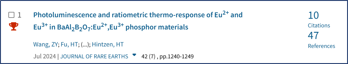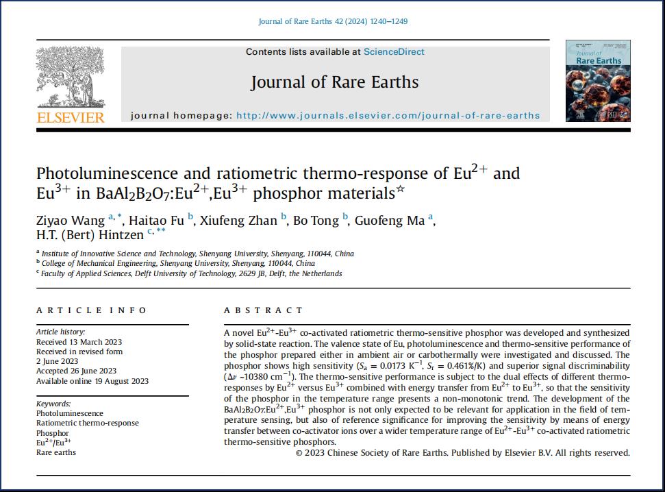 根据基本科学指标数据库(Essential Science Indicators,简称ESI)2024年9月的数据显示,我校科技创新研究院王梓垚副教授发表在Journal of Rare Earths(中科院一区,IF=5.2)期刊上的论文“Photoluminescence and ratiometric thermo-response of Eu2+andEu3+in BaAl2B2O7:Eu2+,Eu3+phosphor materials”入选化学领域ESI全球TOP 1%高被引论文。该论文由我校王梓垚副教授和代尔夫特理工大学H.T. (Bert) Hintzen副教授合作完成。这是我校近年来首次以第一单位发表ESI高被引论文,标志着我校在ESI高被引论文领域取得了新的重要突破。