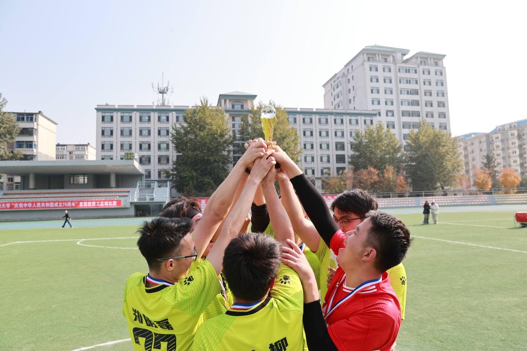 10月12日,由校工会、体育学院主办,教职工足球协会协办的“庆祝中华人民共和国成立75周年”首届教职工足球比赛决赛在北院体育场进行。校党委书记曲向军等校领导莅临现场观赛。经过激烈角逐,信息工程学院获得冠军,生命科学与工程学院获得亚军,外国语学院获得季军。颁奖典礼上,校纪委书记王秀玲、校务委员唐雁、校务委员解勇分别为获得比赛冠、亚、季军的队伍颁发奖杯和奖牌。校工会主席孟醒宣布比赛“最佳组织奖”,体育学院副院长田轶宣布比赛前八名成绩。