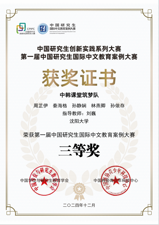 12月22日,由教育部学位管理与研究生教育司指导,中国学位与研究生教育学会、中国科协青少年科技中心联合主办的中国研究生创新实践系列大赛“第一届中国研究生国际中文教育案例大赛”获奖名单揭晓,由我校文法学院刘巍老师指导,国际中文教育专业周芷伊、秦海格、孙静娴等5名研究生组成的“中韩课堂筑梦队”以作品《韩国大邱中文课堂:“结婚证”牵出的中韩婚姻文化奇妙碰撞》荣获全国三等奖。(审核:周斌)
