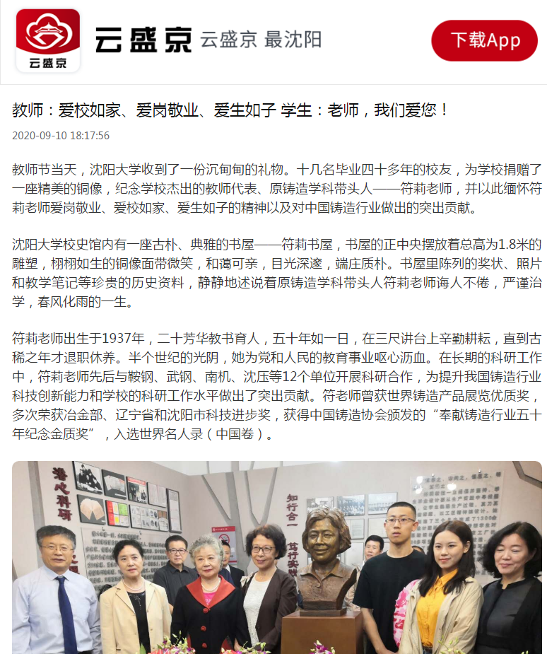 9月10日,云盛京报道了我校符莉教授铜像揭幕仪式相关情况。