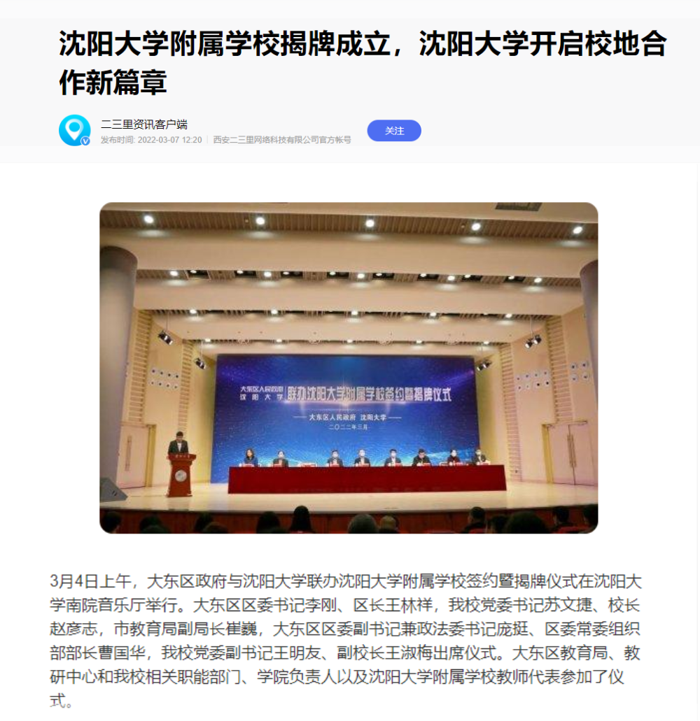 3月7日,【二三里】转载了我校附属学校揭牌成立的新闻。
