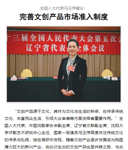 “文创产品源于文化,其作为文化与生活的桥梁,在传承传统文化、丰富民众生活、引领大众审美等方面发挥着重要作用。”全国人大代表、中国戏剧家协会副主席、辽宁省文联副主席、沈阳大学评剧艺术研究中心主任、国家一级演员冯玉萍高度关注传统文化的传承与弘扬,她在调研中发现,随着文创产业逐步发展成为我国潜力巨大的新兴产业,由此衍生出的文创产品也呈井喷之势,与此同时,文创产品市场准入门槛低、缺乏监管等问题,也对产业发展带来不利影响。为此,她向十三届全国人大五次会议提交了《关于完善文创产品市场准入制度的建议》。
