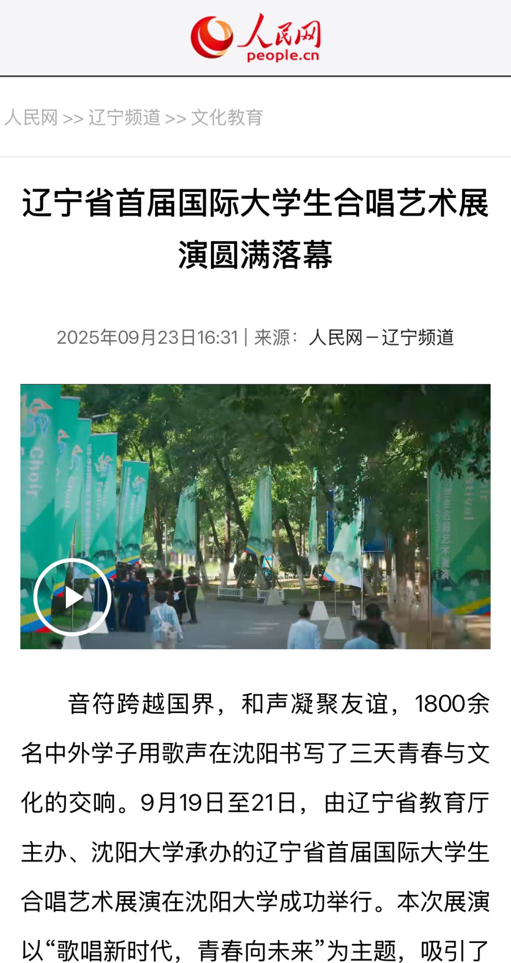 9月23日,【人民网-辽宁频道】报道了在我校举办的辽宁省首届国际大学生合唱艺术展演。