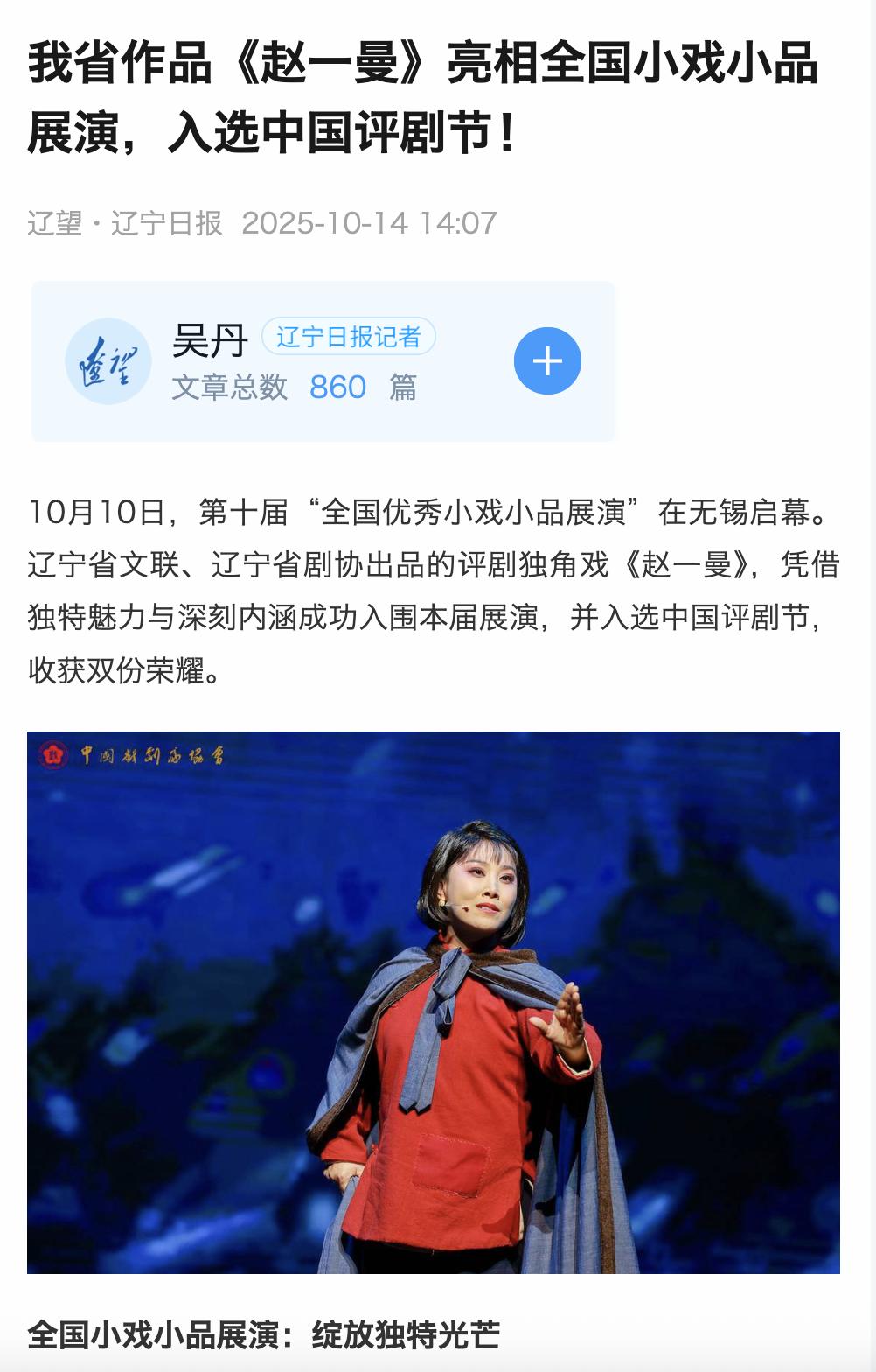 10月10日,第十届“全国优秀小戏小品展演”在无锡启幕。辽宁省文联、辽宁省剧协出品的评剧独角戏《赵一曼》,凭借独特魅力与深刻内涵成功入围本届展演,并入选中国评剧节,收获双份荣耀。