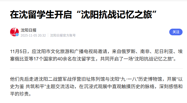 11月5日,应沈阳市文化旅游和广播电视局邀请,来自俄罗斯、南非、尼日利亚、埃塞俄比亚等17个国家的40余名在沈留学生,共同开启了一场“沈阳抗战记忆之旅”。