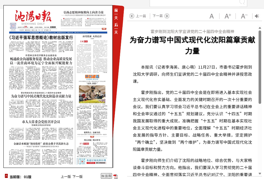 11月28日,《沈阳日报》对市委书记霍步刚来校调研,向师生们宣讲党的二十届四中全会精神并讲授思政课进行了报道。