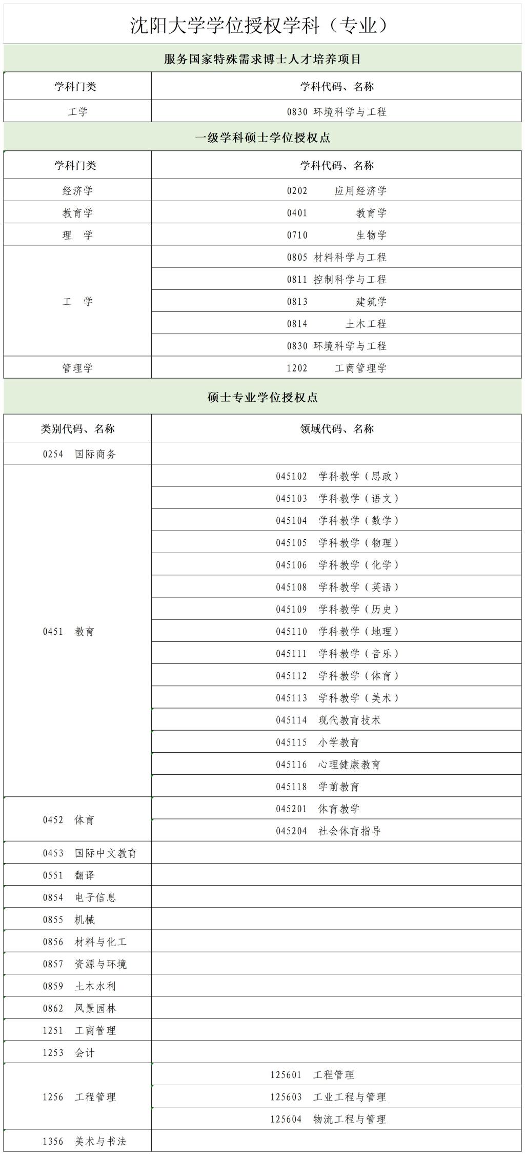 沈阳大学是一所涵盖经济学、法学、教育学、文学、历史学、理学、工学、农学、管理学、艺术学10个学科门类的综合性大学。现有服务国家特殊需求博士人才培养项目“污染场地修复与风险管理”1个,应用经济学、生物学、教育学、材料科学与工程、控制科学与工程、土木工程、环境科学与工程、建筑学、工商管理学一级学科硕士学位授权点9个,教育、体育、国际中文教育、翻译、电子信息、机械、材料与化工、资源与环境、土木水利、工商管理、会计、工程管理、风景园林、国际商务、美术与书法硕士专业学位授权类别15个。2018年,沈阳大学环境科学与工程学科入选辽宁省一流学科建设项目。2019年,沈阳大学服务国家特殊需求博士人才培养项目顺利通过国务院学位委员会验收评估。2021年,沈阳大学环境科学与工程学科联合英国皇家农业大学环境风险管理与可持续发展专业博士学位教育项目获得教育部批准。